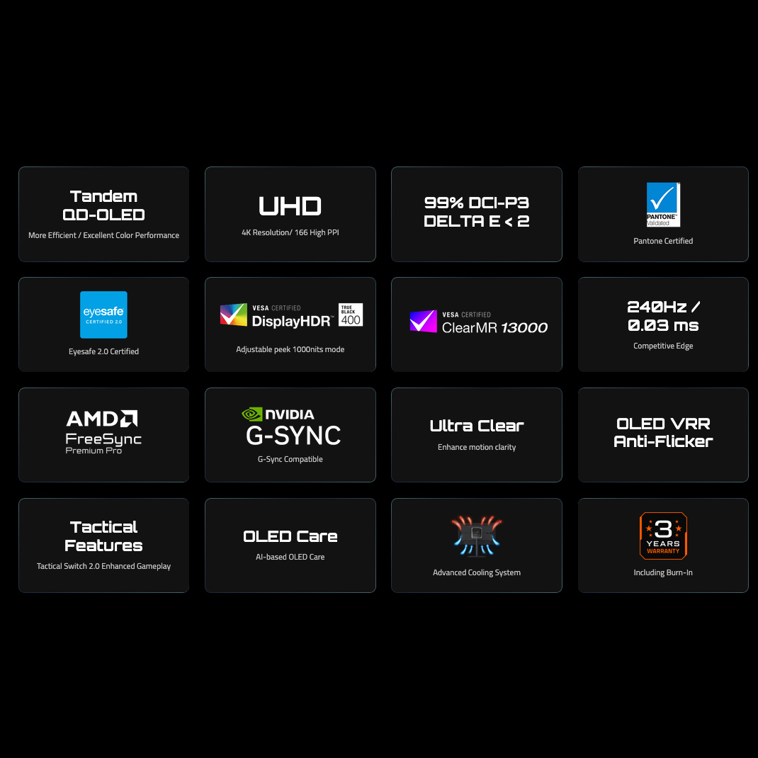 27 Inch Tandem QD-OLED Gaming Monitor - UHD (4K) 3840x2160 - 240Hz - 0.03ms GTG - AMD FreeSync Premium Pro, NVIDIA G-SYNC Compatible - Type C KVM - HDMI, DP, Type-C - Height, Tilt Adjustable - Black