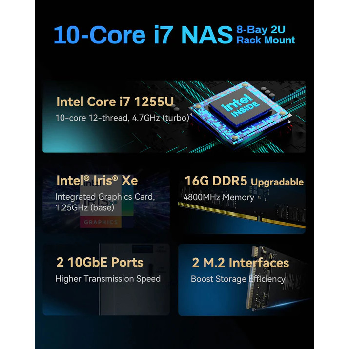 8-Bay, 0TB (Diskless) Rackmount NAS Storage - Intel Core i7-1255U Ultra-Short 1U, 16GB DDR5, 2x 10GbE Ports